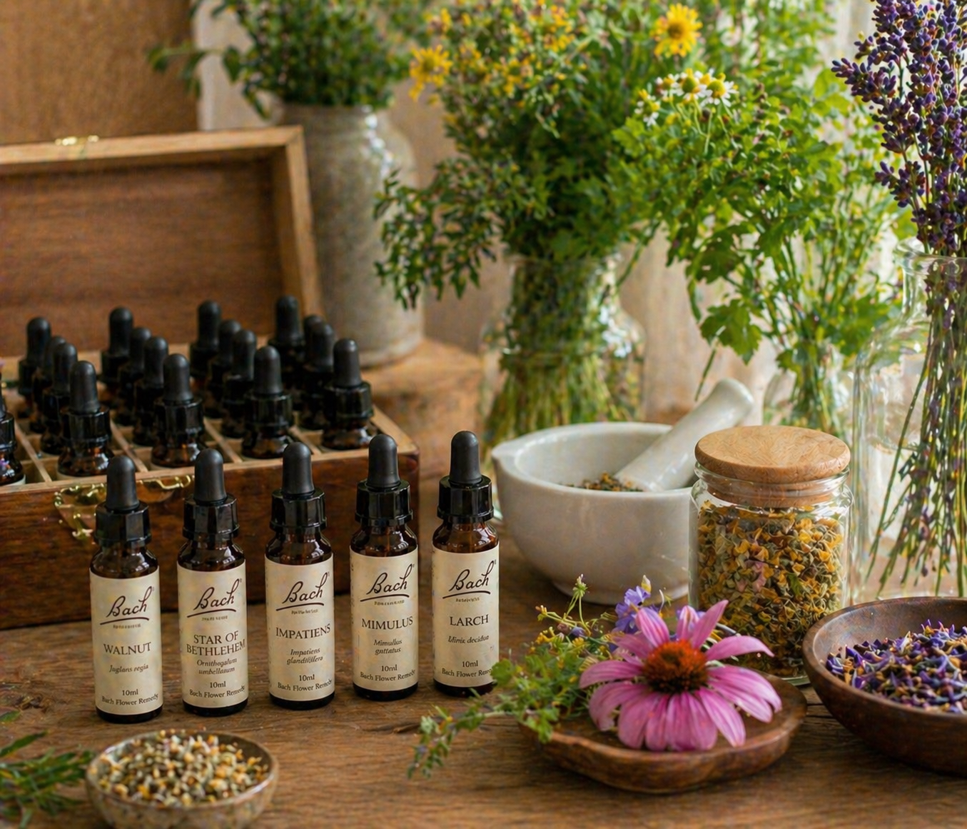 Natural plant-based remedies supporting relaxation, emotional balance, and overall wellbeing in a holistic lifestyle approach.